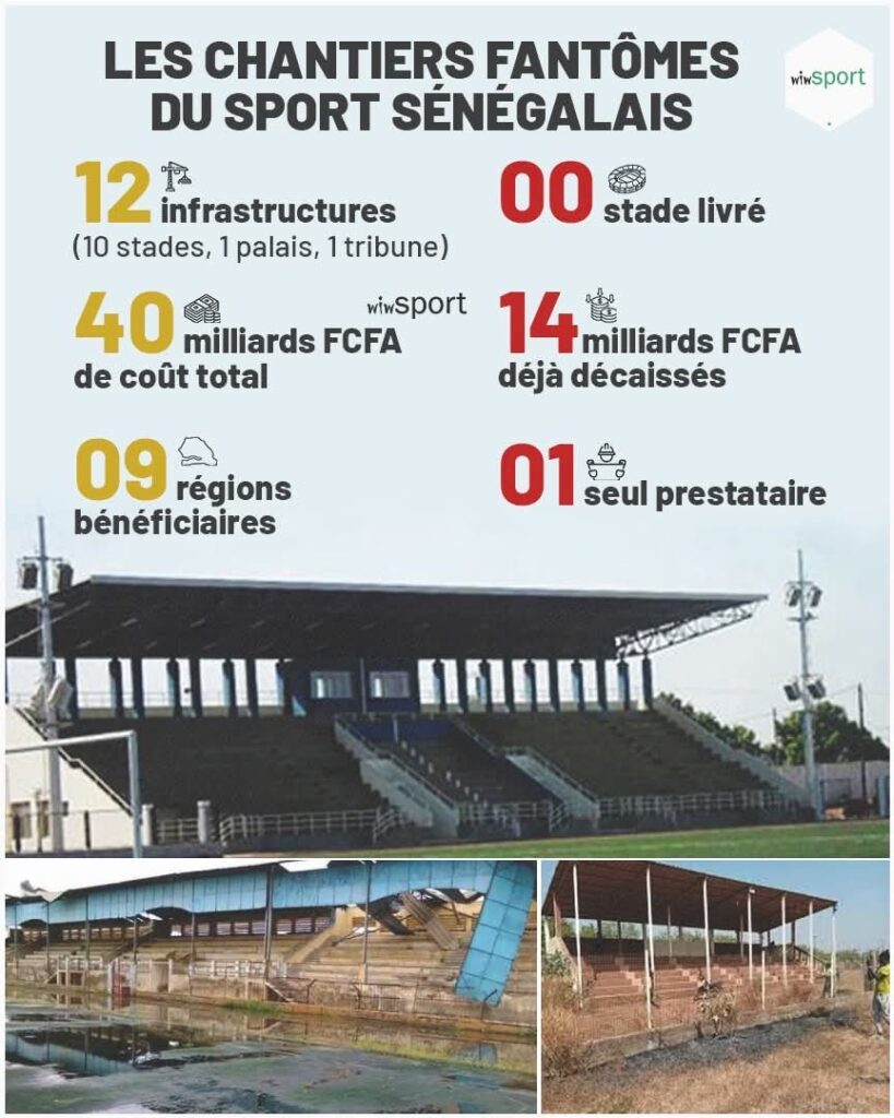 Un rapport de wiwsport révèle une situation préoccupante dans le secteur des infrastructures sportives au Sénégal. Sur 12 chantiers lancés — dont 10 stades, 1 palais des sports et 1 tribune — aucun n’a encore été livré, malgré le décaissement de 14 milliards FCFA sur un coût total estimé à 40 milliards FCFA.