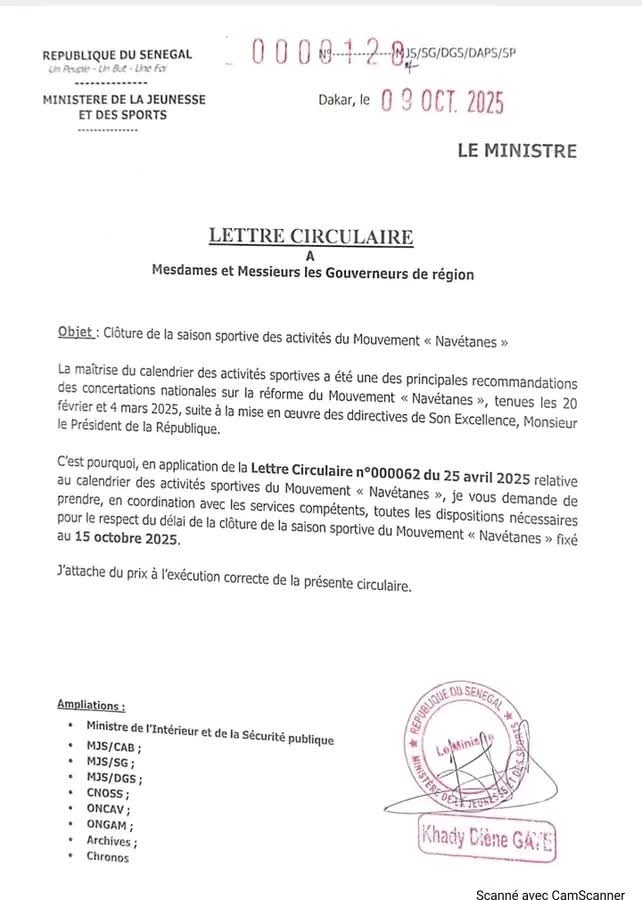 La ministre de la Jeunesse et des Sports, Khady Diène Gaye, a annoncé, dans une lettre circulaire datée du 9 octobre 2025, la clôture officielle de la saison sportive du mouvement « Navétanes » pour le 15 octobre prochain.