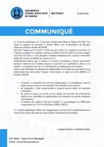 Réuni en urgence le mercredi 11 février 2026, sous la présidence du Recteur, Professeure Aïssatou Badara KANDJI, le Conseil académique a examiné la situation sécuritaire à la suite des incidents survenus le lundi 9 février 2026 au sein du campus social.