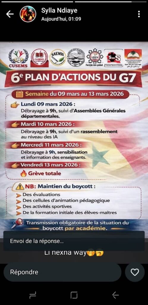 Le G7, regroupement de plusieurs syndicats de l’enseignement, a annoncé la mise en œuvre de son 6ᵉ plan d’actions prévu du 09 au 13 mars 2026, marquant une nouvelle phase de mobilisation dans le secteur éducatif au Sénégal.