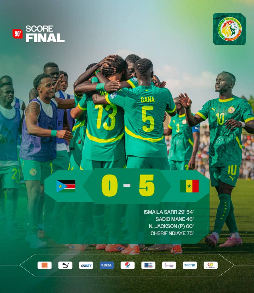 Le Sénégal a signé une victoire éclatante ce vendredi face au Soudan du Sud (5-0), confirmant ainsi sa suprématie dans les éliminatoires de la Coupe du monde 2026. Les Lions de la Téranga ont dominé la rencontre du début à la fin, avec un doublé d’Ismaïla Sarr (29ᵉ, 54ᵉ), un but de Sadio Mané dès le retour des vestiaires (46ᵉ), un penalty transformé par Nicolas Jackson (60ᵉ) et une dernière réalisation signée Chérif Ndiaye (75ᵉ).