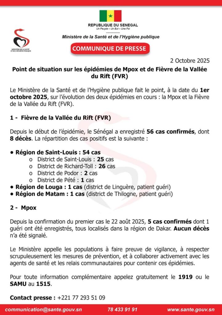 Le ministère de la Santé et de l’Hygiène publique a publié, ce jeudi 2 octobre 2025, un point de situation sur les épidémies de Fièvre de la Vallée du Rift (FVR) et de Mpox.