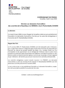 La Cour d’appel de Versailles a émis, ce mardi 3 mars 2026, un avis partiellement favorable à la demande d’extradition formulée par les autorités de la République du Sénégal visant M. Madiambal Ba Diagne, selon un communiqué du Ministère de la Justice.