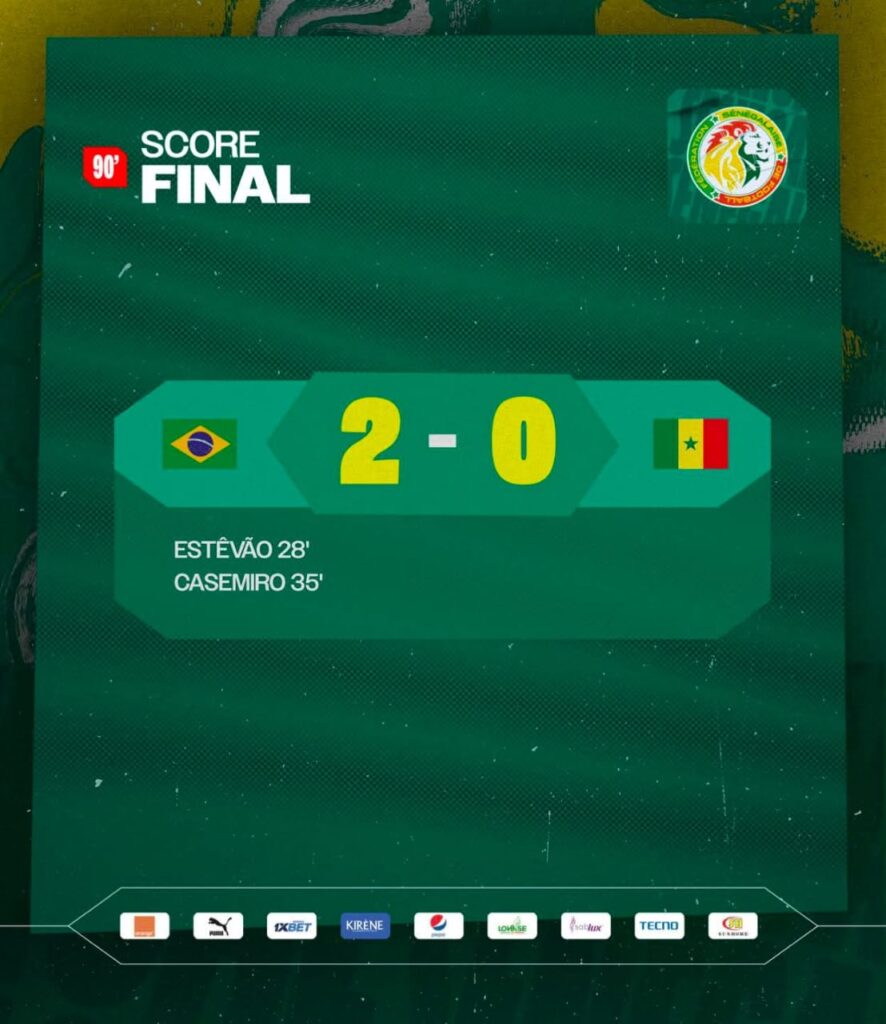 Le Sénégal s’est incliné (0-2) ce samedi face au Brésil, en match amical disputé au stade Émirats de Londres, mettant fin à une impressionnante série de 26 matchs sans défaite. Face à une Seleçao redoutable, menée par un trio offensif explosif Vinicius – Estêvão – Rodrygo, les hommes de Pape Thiaw ont longtemps résisté avant de céder.