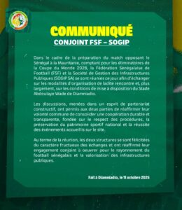 La Fédération Sénégalaise de Football (FSF) et la Société de Gestion des Infrastructures Publiques (SOGIP SA) ont tenu ce samedi 11 octobre 2025 une réunion à Diamniadio, dans le cadre des préparatifs du match Sénégal–Mauritanie comptant pour les éliminatoires de la Coupe du Monde 2026.