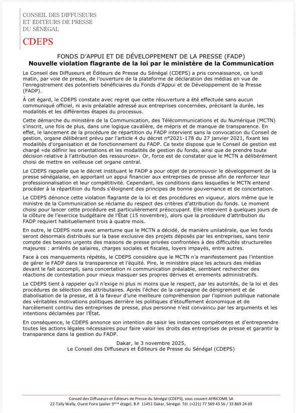 Le Conseil des Diffuseurs et Éditeurs de Presse du Sénégal (CDEPS) a vivement dénoncé, ce lundi, l’ouverture par le ministère de la Communication, des Télécommunications et du Numérique (MCTN) de la plateforme d’enregistrement des médias pour le Fonds d’Appui et de Développement de la Presse (FADP), sans consultation préalable ni convocation du Conseil de gestion, comme le prévoit le décret du 27 janvier 2021.