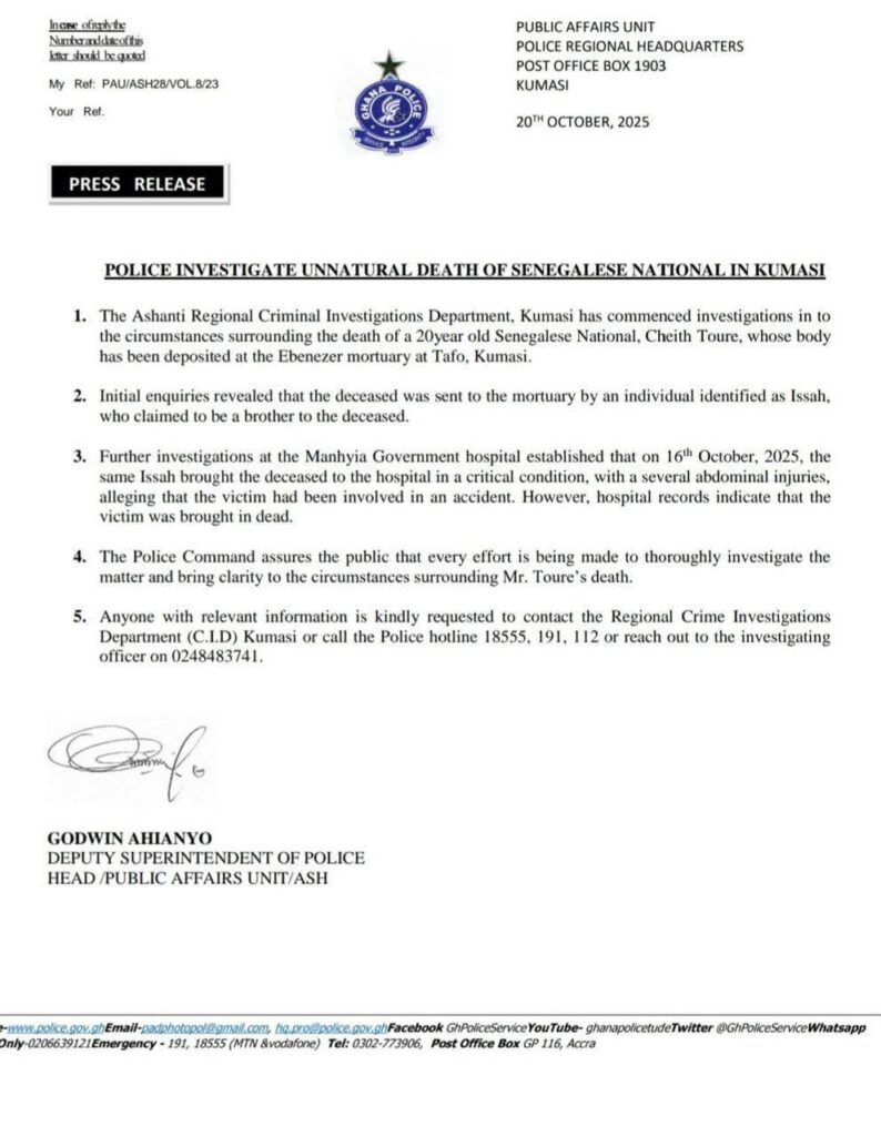 La police régionale d’Ashanti, au Ghana, a ouvert une enquête sur la mort jugée « non naturelle » d’un ressortissant sénégalais âgé de 20 ans, identifié sous le nom de Cheikh Touré. Selon un communiqué publié ce 20 octobre 2025 par le Département régional des enquêtes criminelles de Kumasi, le corps du jeune homme a été déposé à la morgue Ebenezer de Tafo.