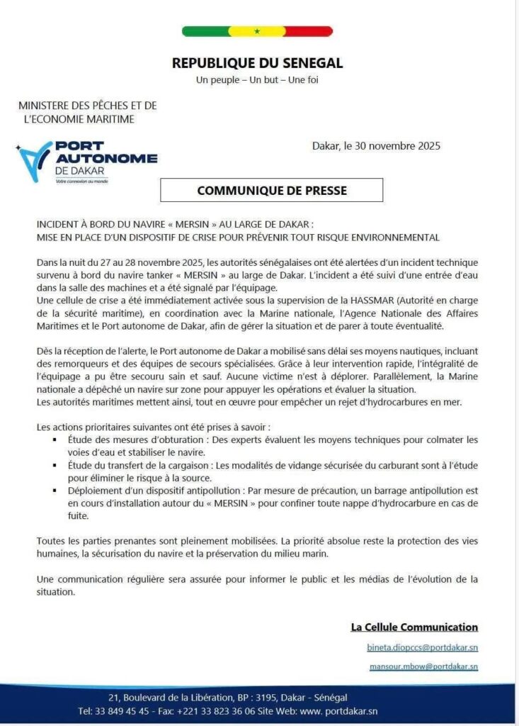 Les autorités sénégalaises ont activé, dans la nuit du 27 au 28 novembre 2025, un dispositif de crise après un incident technique survenu à bord du navire tanker Mersin, au large de Dakar. L’équipage a signalé une entrée d’eau dans la salle des machines, déclenchant une intervention immédiate coordonnée par la Haute autorité chargée de la sécurité maritime (HASSMAR), en collaboration avec la Marine nationale, l’Agence nationale des Affaires maritimes et le Port autonome de Dakar.