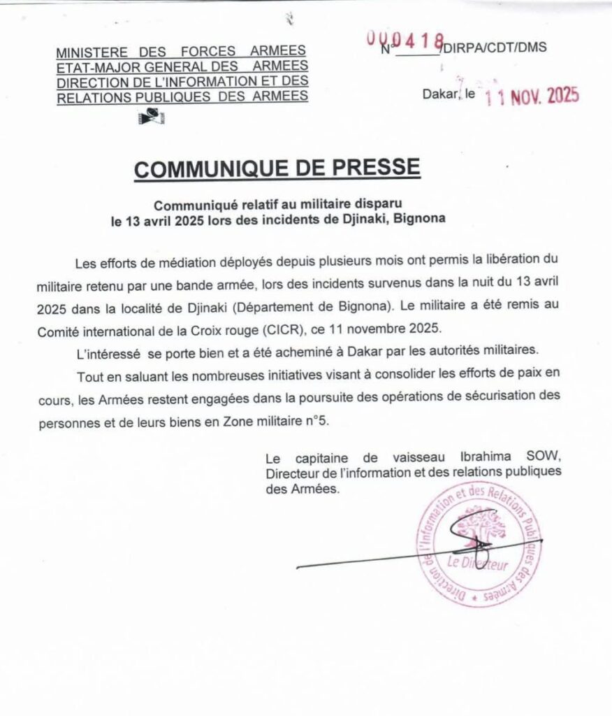 Le ministère des Forces armées a annoncé, à travers un communiqué rendu public ce mardi, la libération du militaire porté disparu depuis le 13 avril 2025 à Djinaki, dans le département de Bignona.