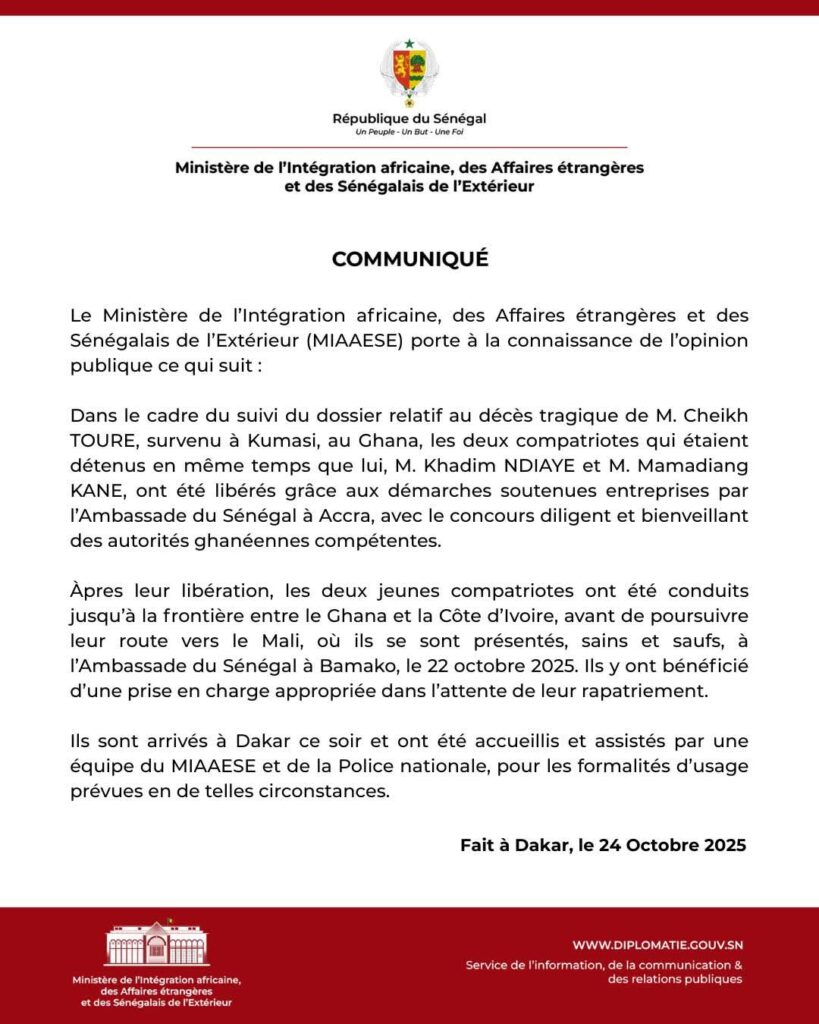 Le ministère de l’Intégration africaine, des Affaires étrangères et des Sénégalais de l’extérieur (MIAAEE) a annoncé ce vendredi 24 octobre 2025 la libération de deux compatriotes, Khadim Ndiaye et Mamadiang Kane, précédemment détenus à Kumasi (Ghana) dans le cadre de l’affaire liée au décès tragique de Cheikh Touré.