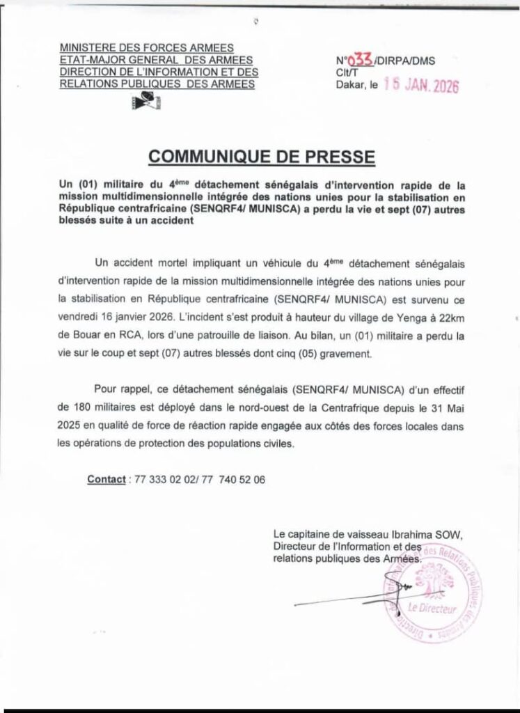 Un militaire sénégalais du 4ᵉ détachement d’intervention rapide de la Mission multidimensionnelle intégrée des Nations unies pour la stabilisation en République centrafricaine (SENQRF4/MINUSCA) a perdu la vie et sept autres ont été blessés, dont cinq grièvement, à la suite d’un accident survenu ce vendredi 16 janvier 2026.