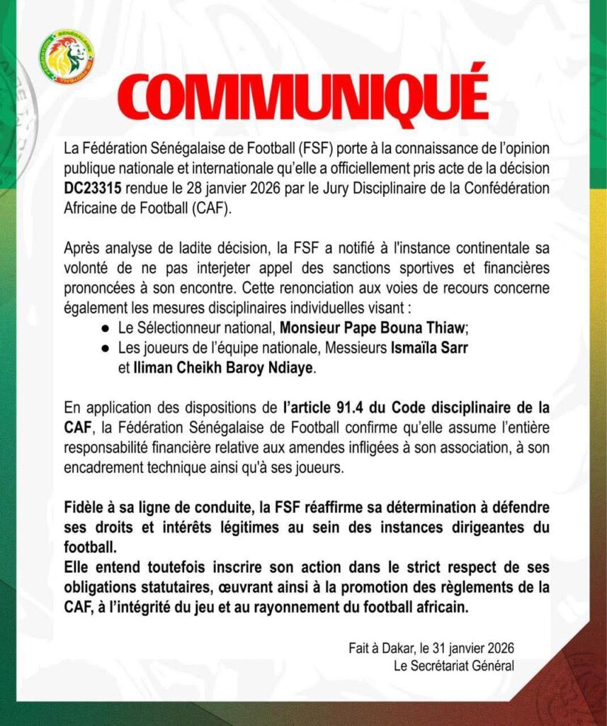 La Fédération Sénégalaise de Football (FSF) a officiellement pris acte de la décision DC23315, rendue le 28 janvier 2026 par le Jury disciplinaire de la Confédération Africaine de Football (CAF).