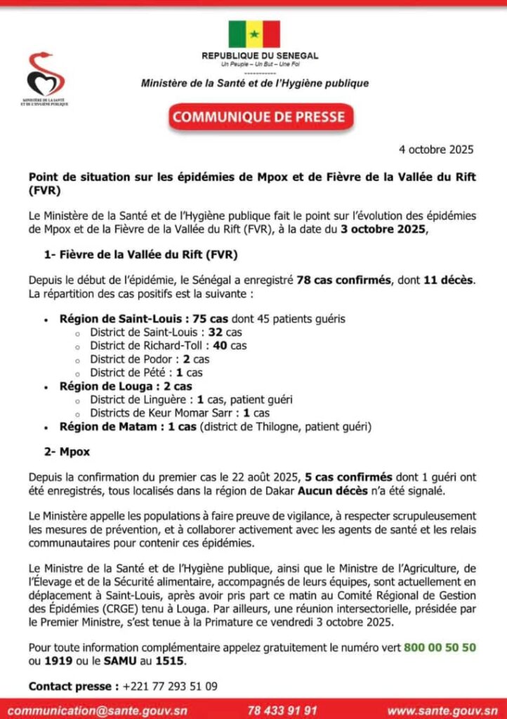 Le ministère de la Santé et de l’Hygiène publique a publié, ce 4 octobre 2025, un point de situation sur les épidémies de Fièvre de la Vallée du Rift (FVR) et de Mpox.