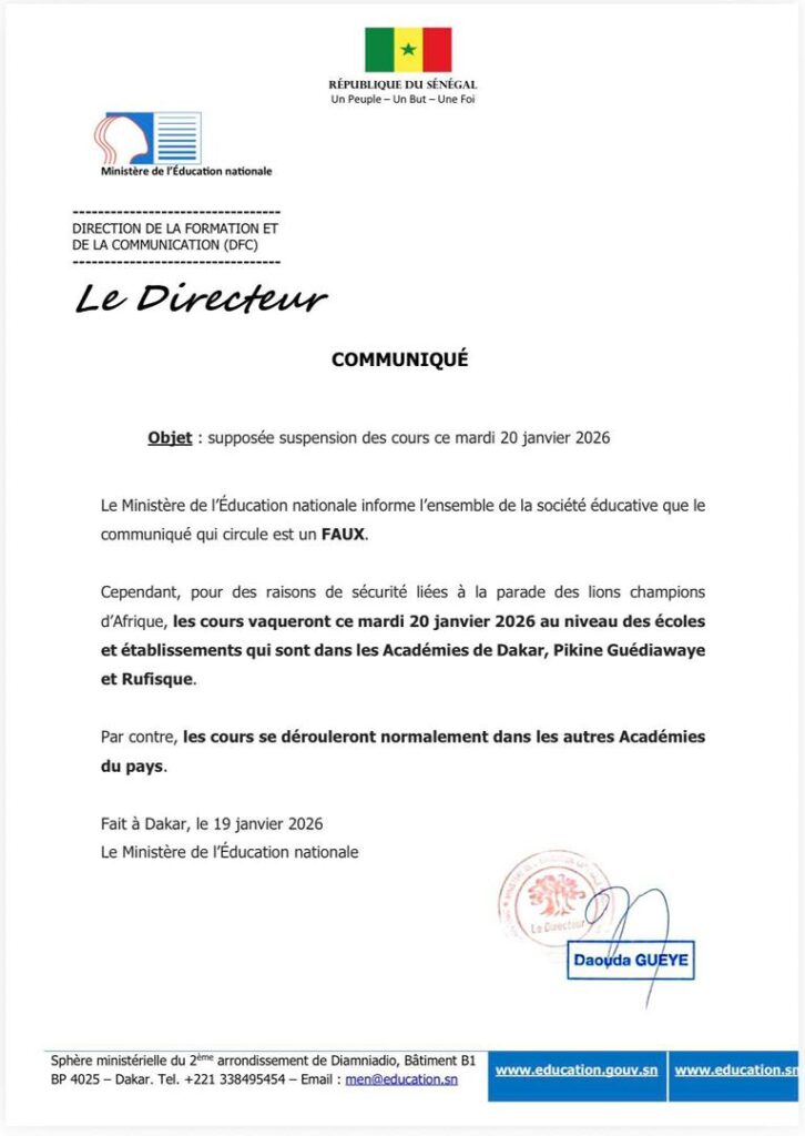 Toutefois, pour des raisons de sécurité liées à la parade des Lions, champions d’Afrique, les autorités éducatives annoncent que les cours vaqueront exceptionnellement ce mardi 20 janvier 2026 dans les écoles et établissements relevant des Académies de Dakar, Pikine-Guédiawaye et Rufisque.